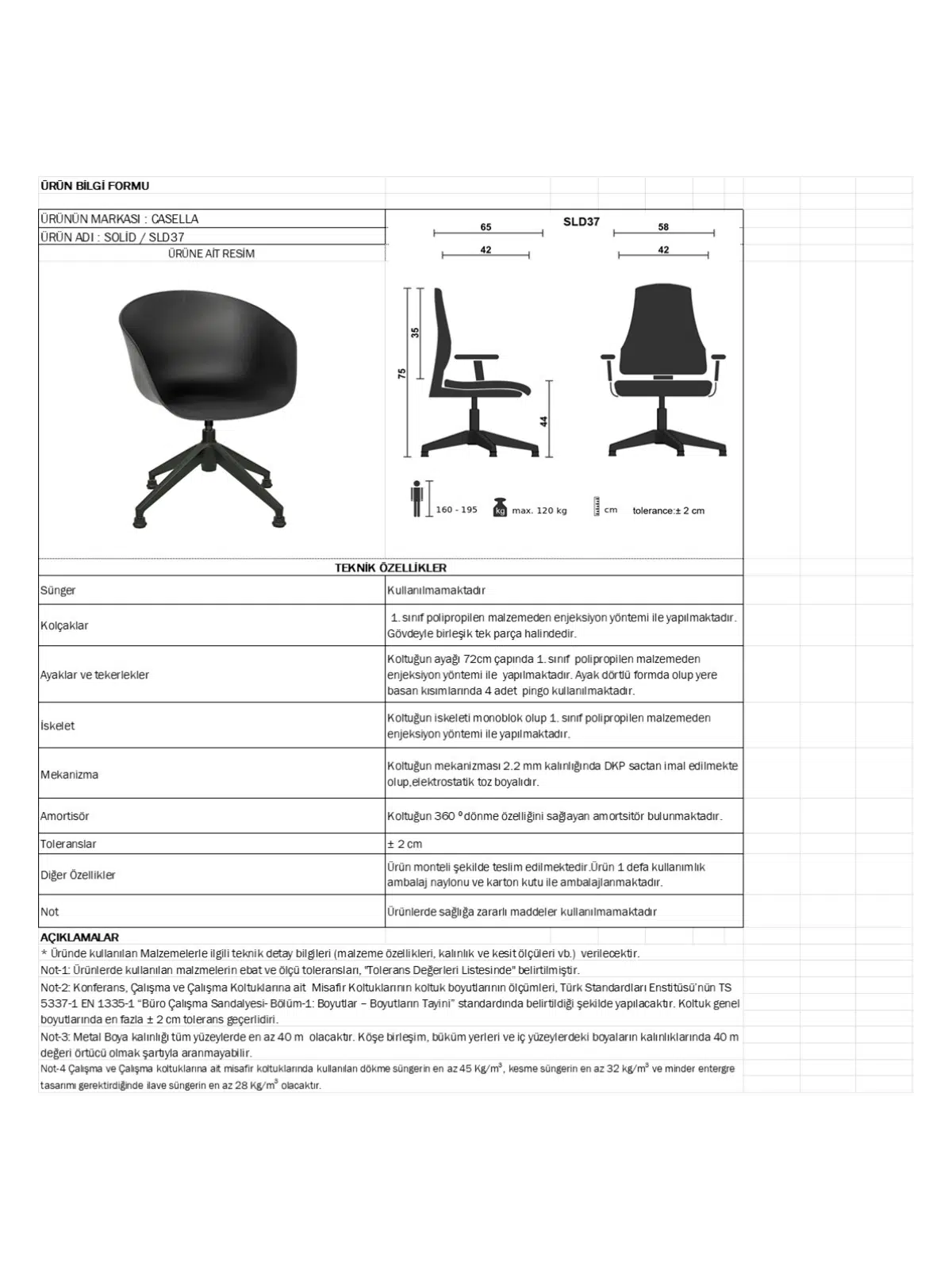 | Mekanizma | Amortisörlü yükseklik Ve sırt eğimi ayarı |