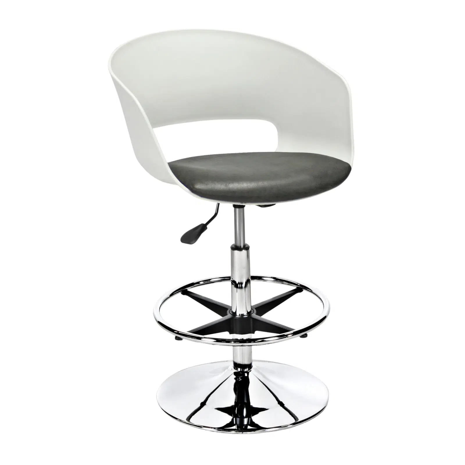 Flanş ayaklı beyaz plastik gövdeli amortisörlü döşemeli bar taburesi, modern tasarımı ve fonksiyonel yapısı ile kafe, restoran, mutfak barları ve sosyal alanlar için konforlu bir oturma çözümü sunar. Dayanıklı beyaz plastik gövde, sade ve şık görünümü ile mekana ferah bir atmosfer kazandırırken uzun ömürlü kullanım sağlar.