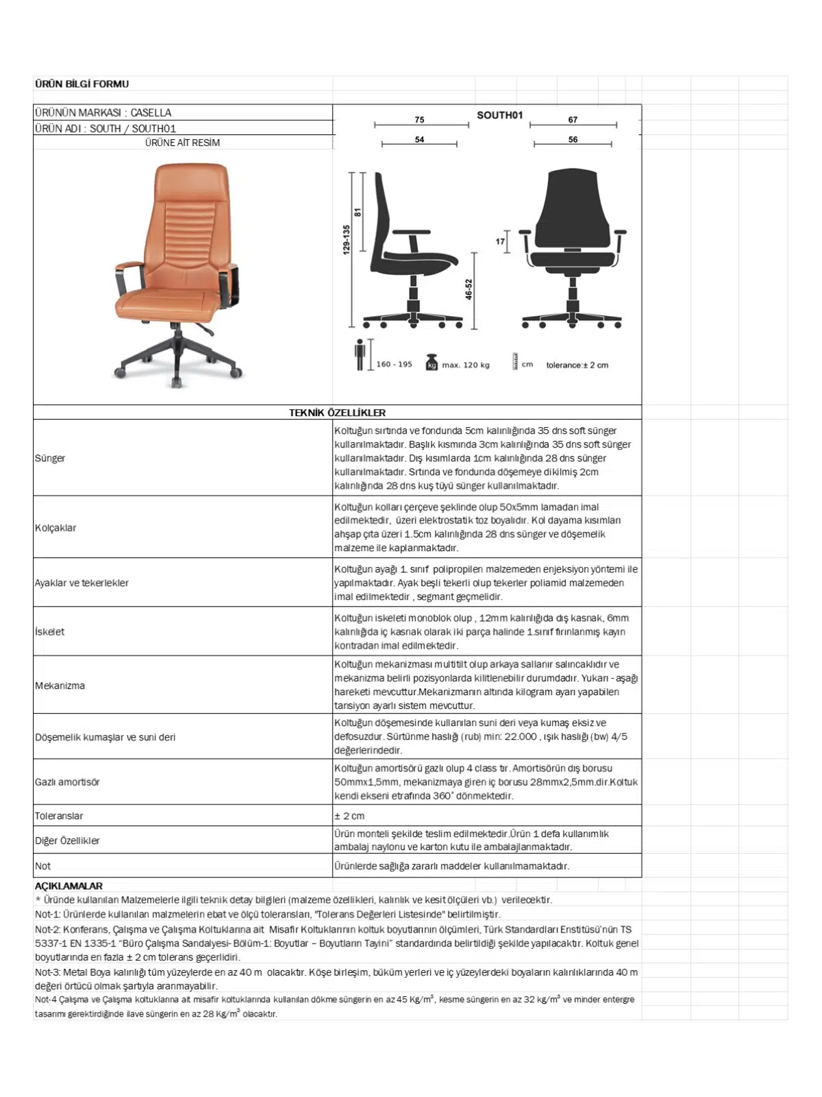 | Mekanizma | Synchro/tilt, çok kademeli kilit, ağırlık ayarı (modele göre) |