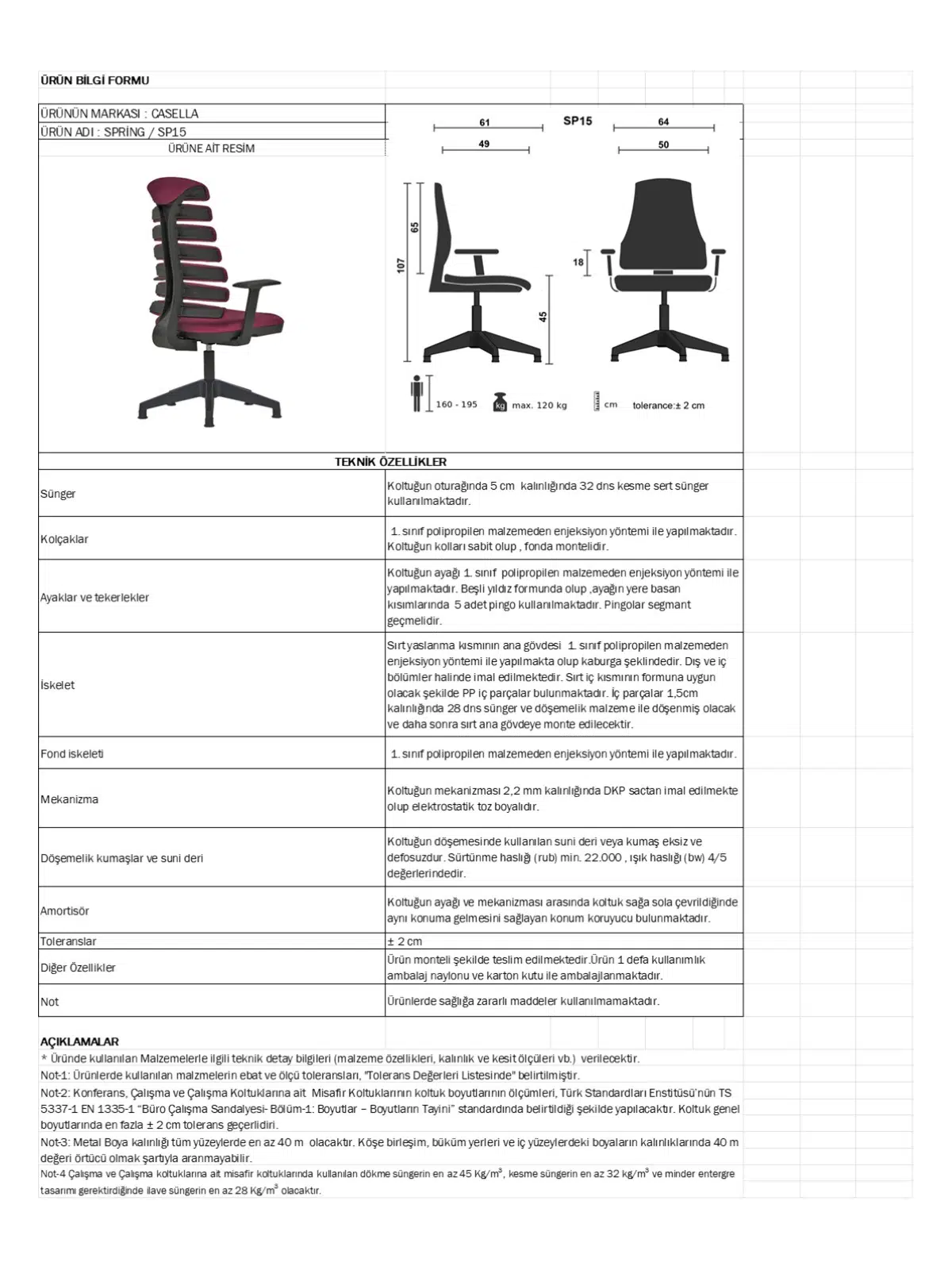 | Mekanizma | Amortisörlü yükseklik Ve sırt eğimi ayarı |