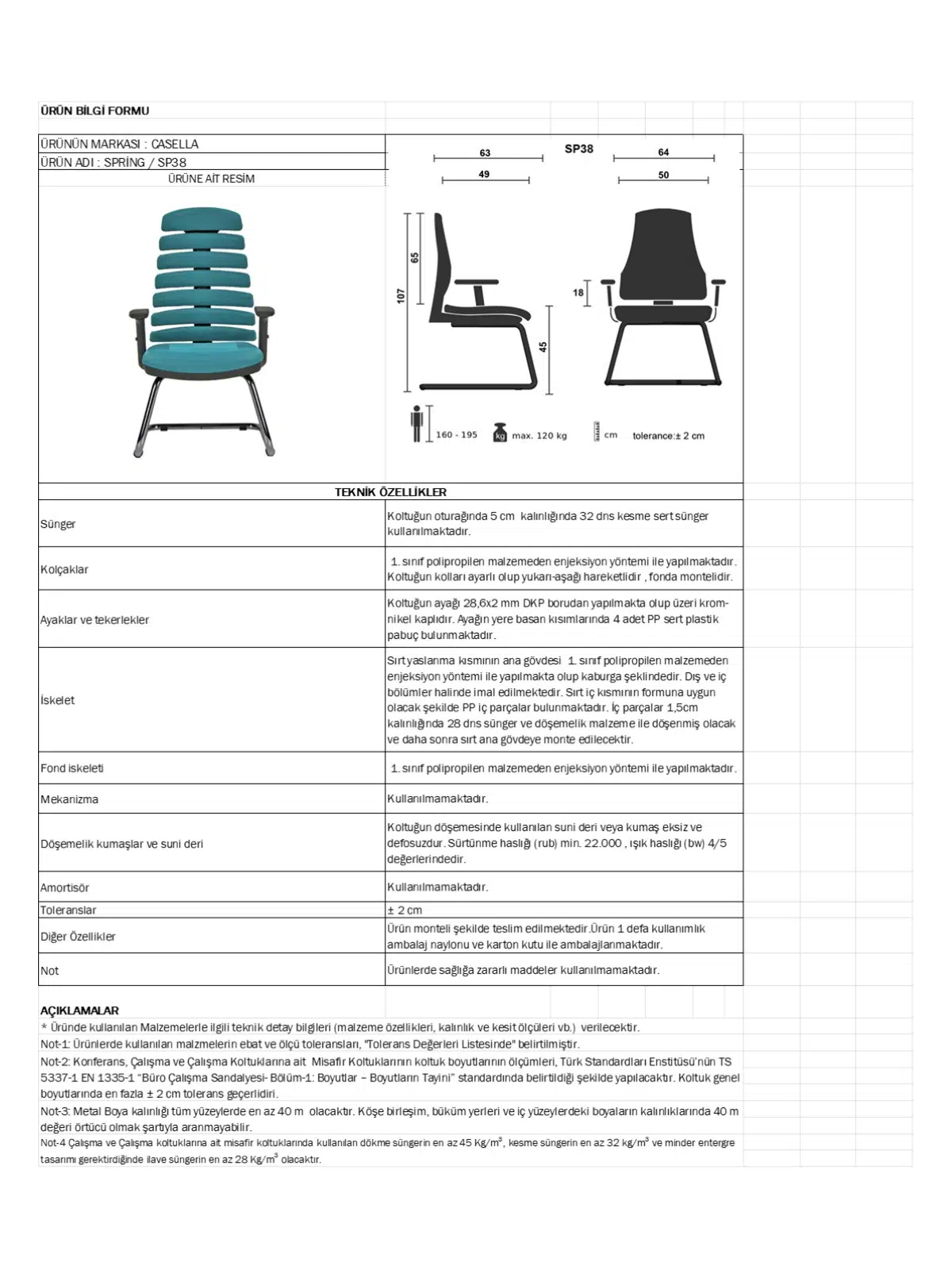 | Mekanizma | Amortisörlü yükseklik Ve sırt eğimi ayarı |