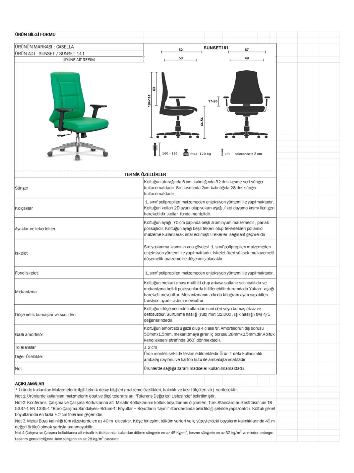 | Mekanizma | Amortisörlü yükseklik Ve sırt eğimi ayarı |