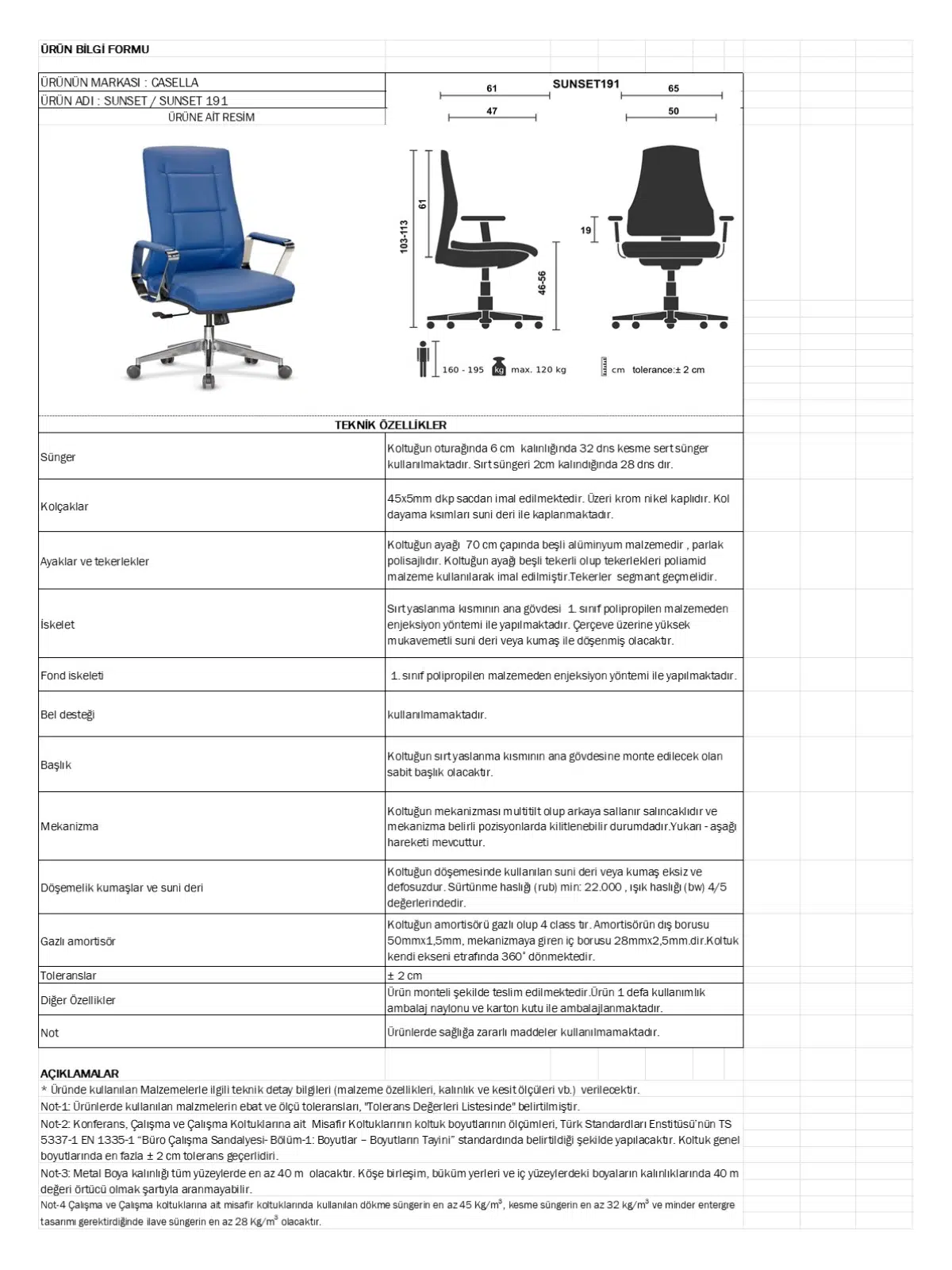 | Mekanizma | Amortisörlü yükseklik Ve sırt eğimi ayarı |