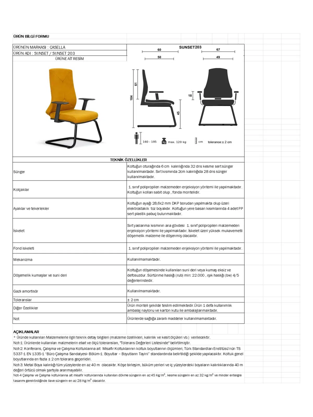 | Mekanizma | Amortisörlü yükseklik Ve sırt eğimi ayarı |