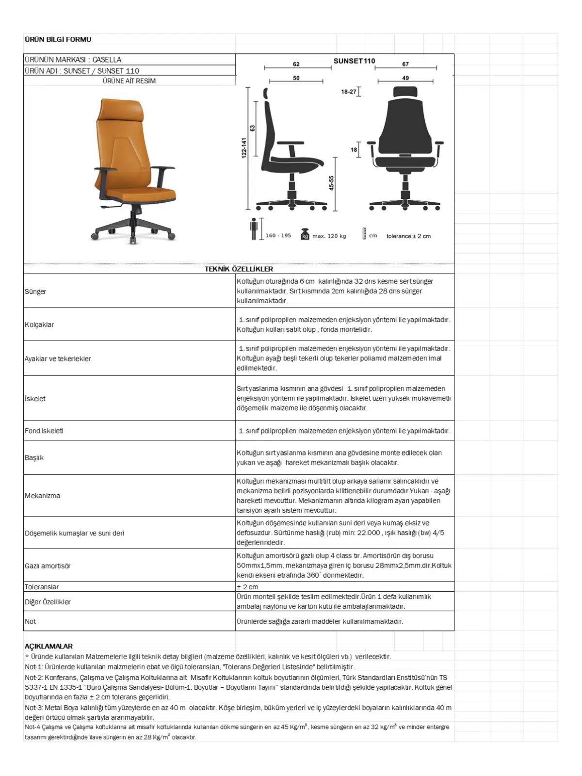 | Mekanizma | Amortisörlü yükseklik Ve sırt eğimi ayarı |