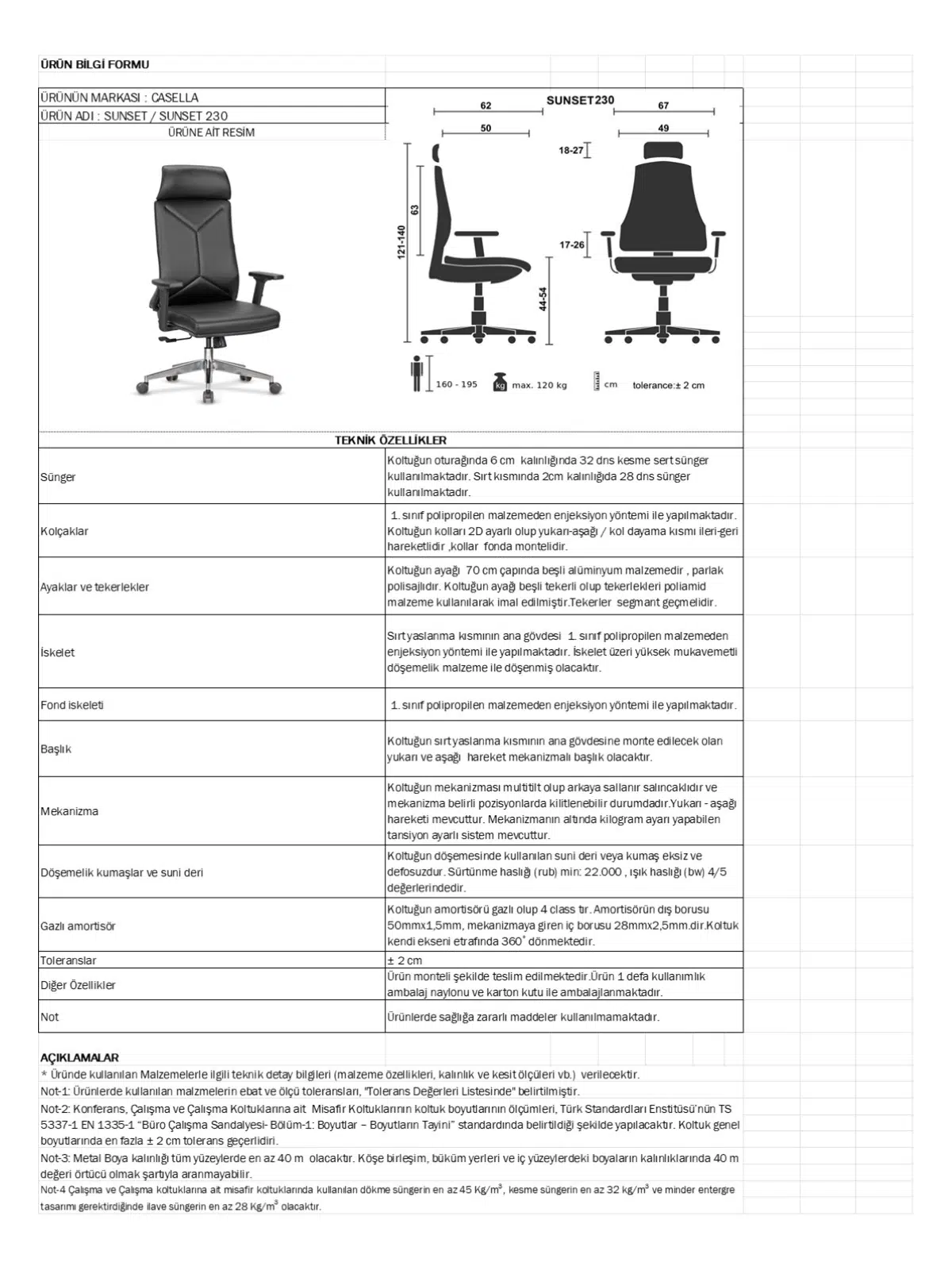 | Mekanizma | Amortisörlü yükseklik Ve sırt eğimi ayarı |
