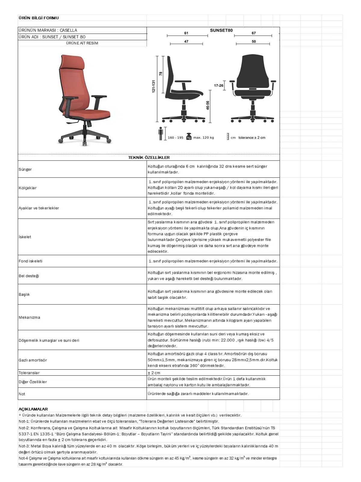 | Mekanizma | Amortisörlü yükseklik Ve sırt eğimi ayarı |