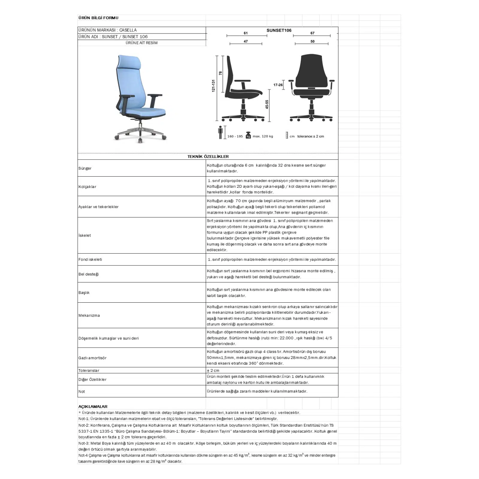 Ayarlanabilir kolçaklar, farklı masa yüksekliklerine ve kullanıcı ihtiyaçlarına göre kişiselleştirilebilir destek sunar. Dayanıklılığı ve modern görünümüyle öne çıkan alüminyum yıldız ayak, ofis ortamlarında hem estetik hem de uzun ömürlü kullanım avantajı sağlar. Sunset-106 modeli; yönetici ofisleri, bireysel çalışma alanları ve kurumsal ofisler için ideal bir çözümdür.