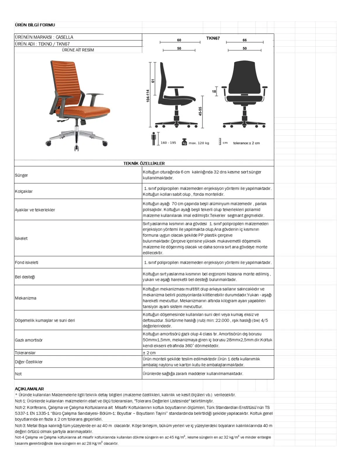 | Mekanizma | Amortisörlü yükseklik Ve sırt eğimi ayarı |