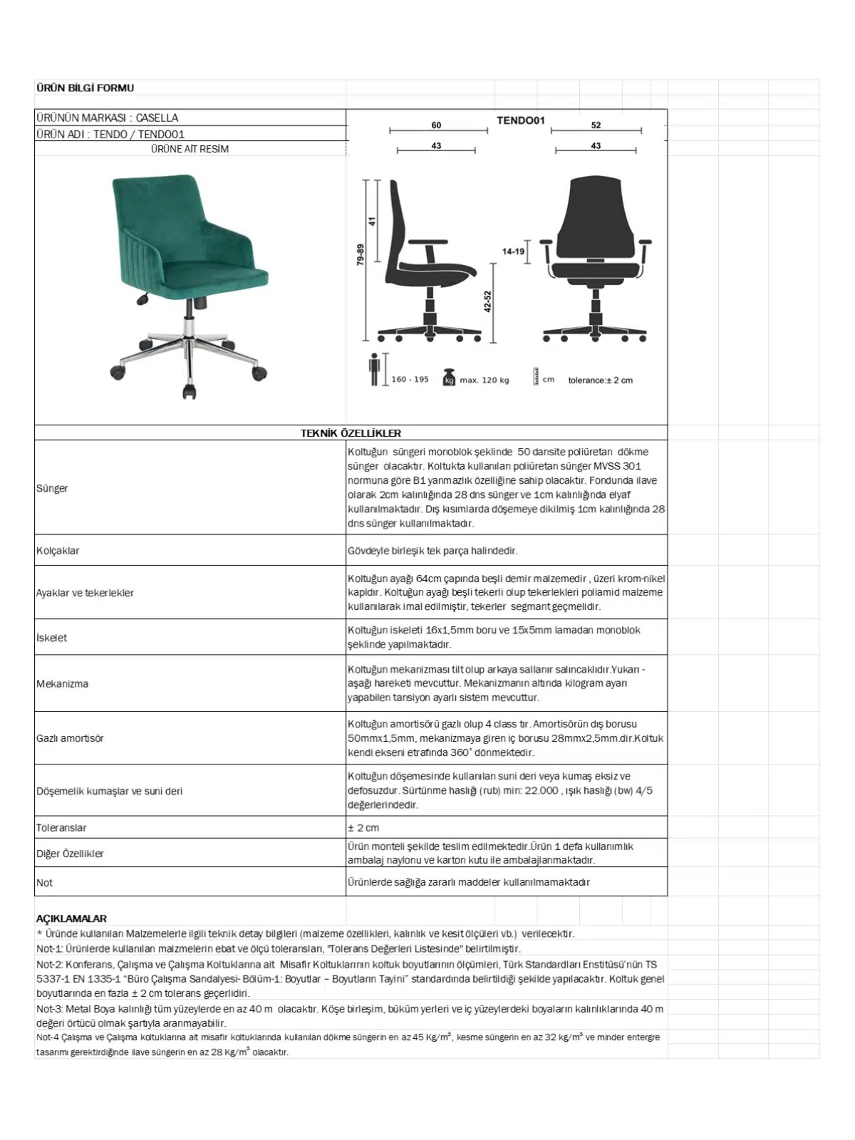 | Döşeme | Gerçek deri / suni deri / leke tutmaz kumaş; file sırt opsiyonu |