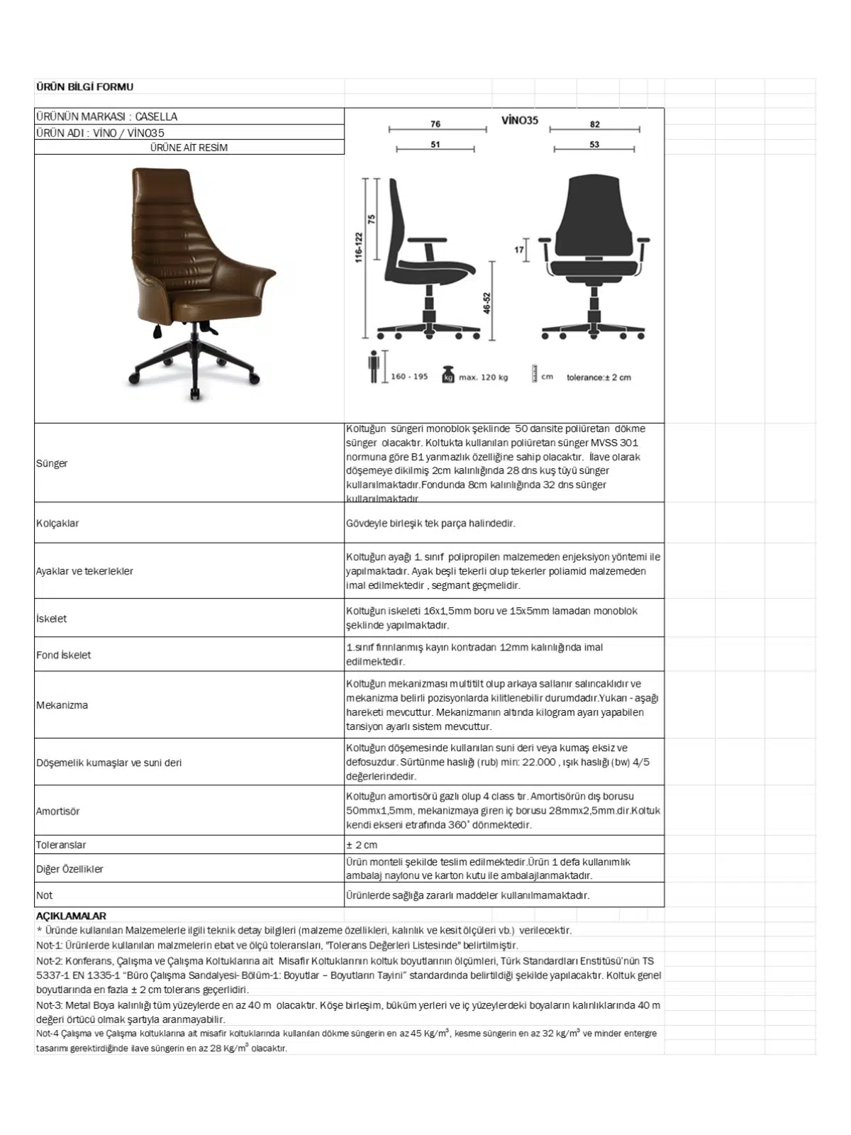 | Mekanizma | Amortisörlü yükseklik Ve sırt eğimi ayarı |