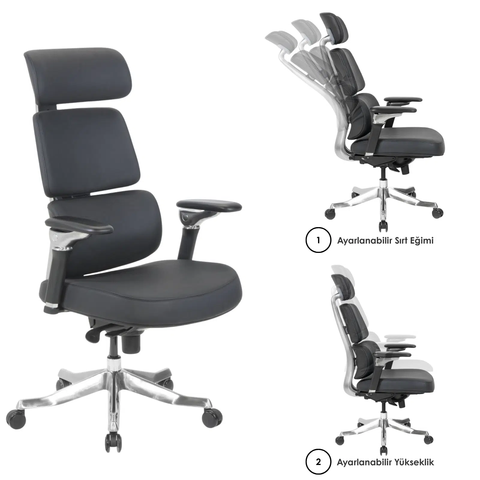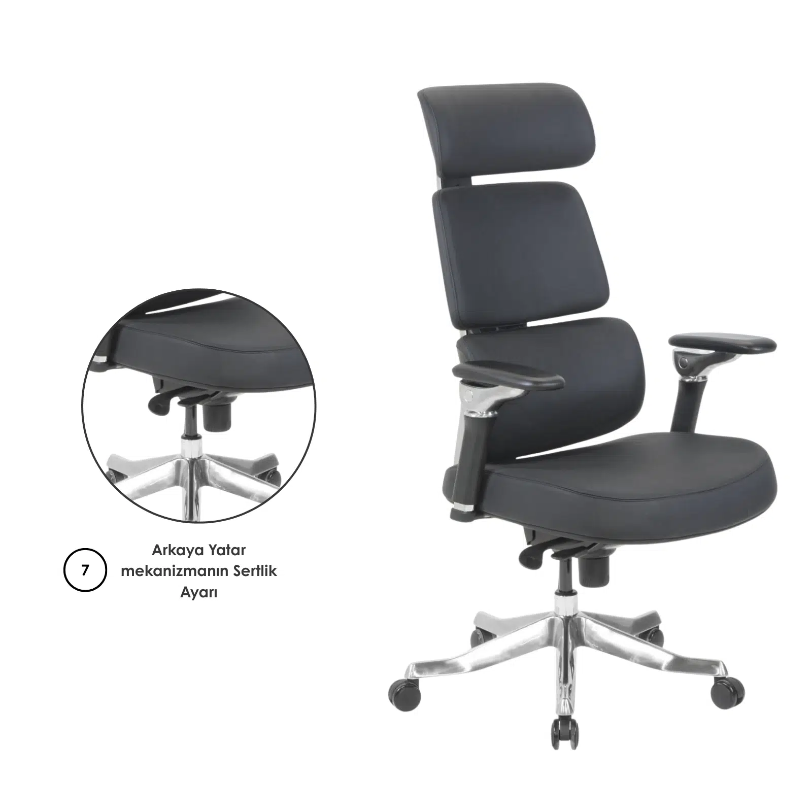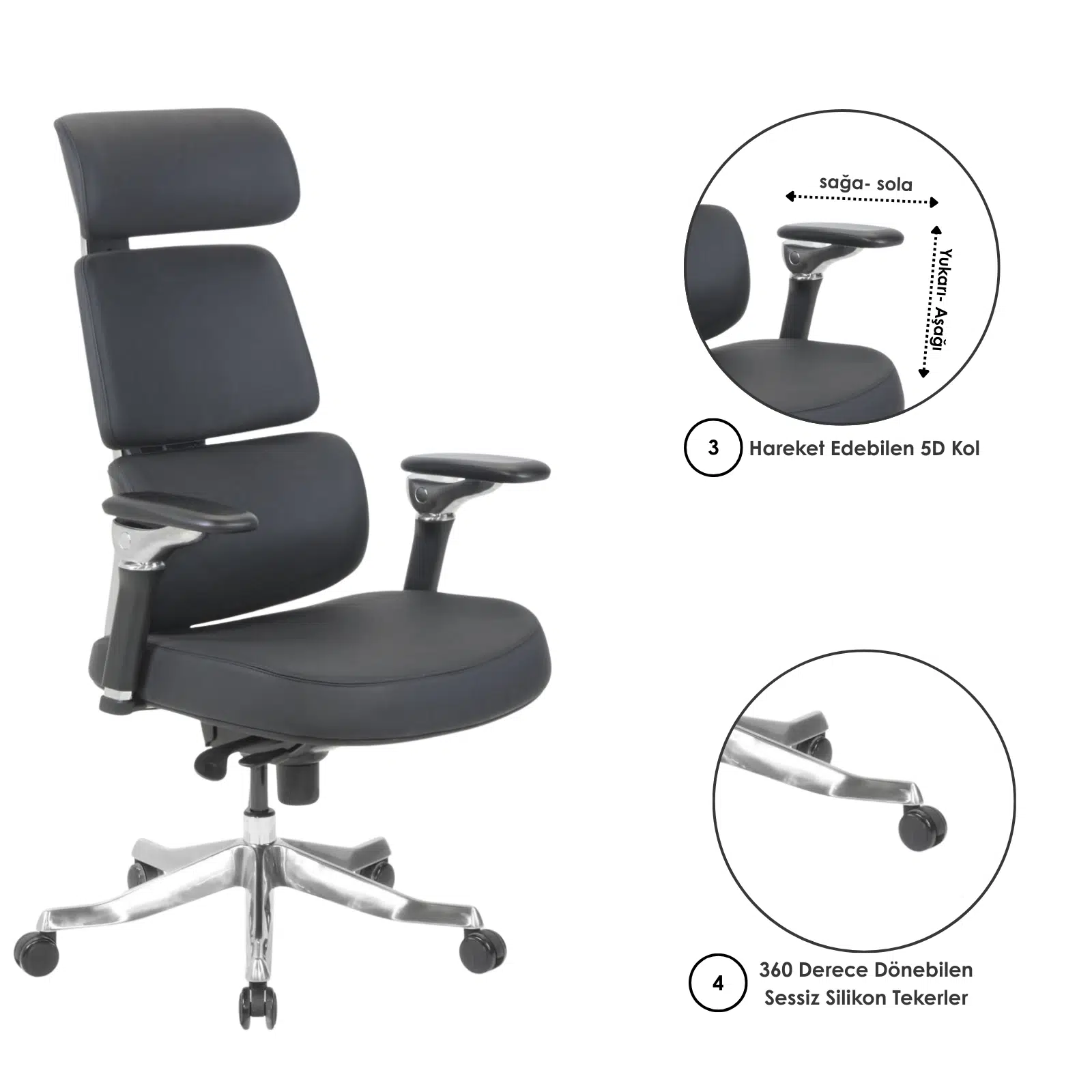 Üst düzey ergonomi ve konfor sunmak üzere tasarlanan 5D ayarlı kollu, alüminyum ayaklı ve başlıklı yönetici ofis koltuğu, yoğun tempoda çalışan yöneticiler için maksimum destek sağlar. Modern ve güçlü tasarımıyla yönetici ofislerine prestijli bir görünüm kazandırır.
