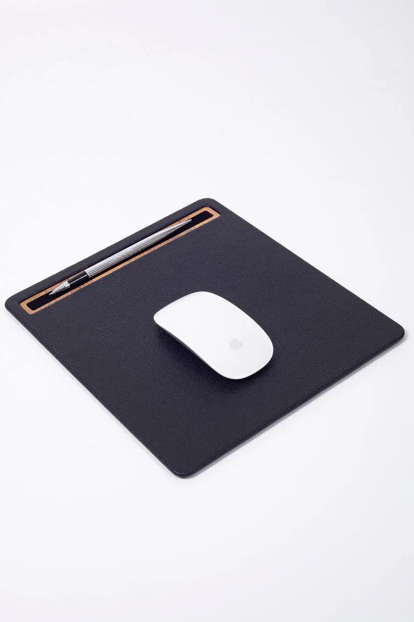 Deri Mousepad, masa üstünde hem konforlu kullanım hem de estetik bütünlük arayanlar için tasarlanmış şık bir ofis aksesuarıdır. Siyah deri yüzeyi, doğal ahşap detayıyla tamamlanarak modern ve prestijli bir görünüm sunar.