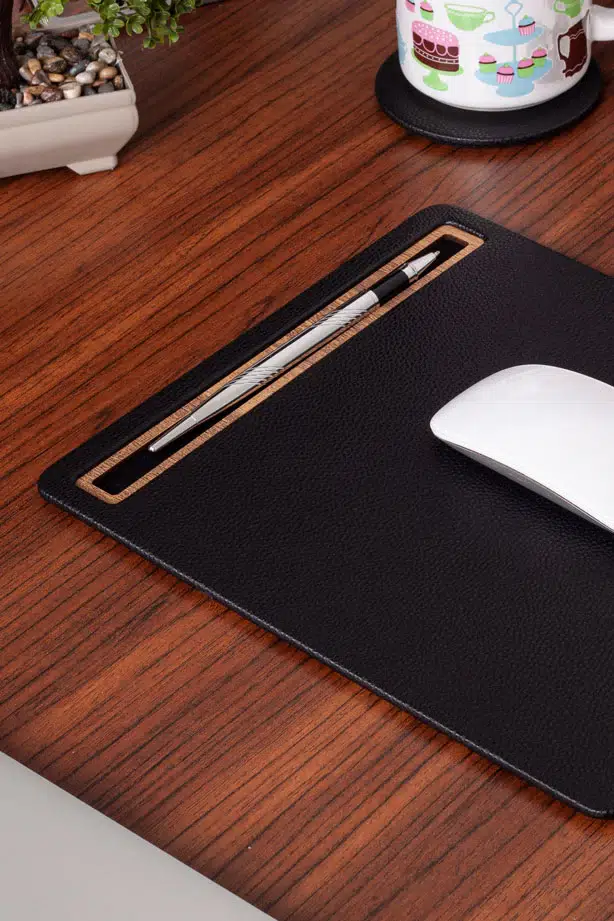 Deri Mousepad – Siyah Ahşap Detaylı, fonksiyonelliği estetikle buluşturan özel bir masa üstü aksesuarıdır. Uzun süreli kullanımlarda konfor sunarken, ahşap detayıyla ofis masasının genel tasarım çizgisini güçlendirir.