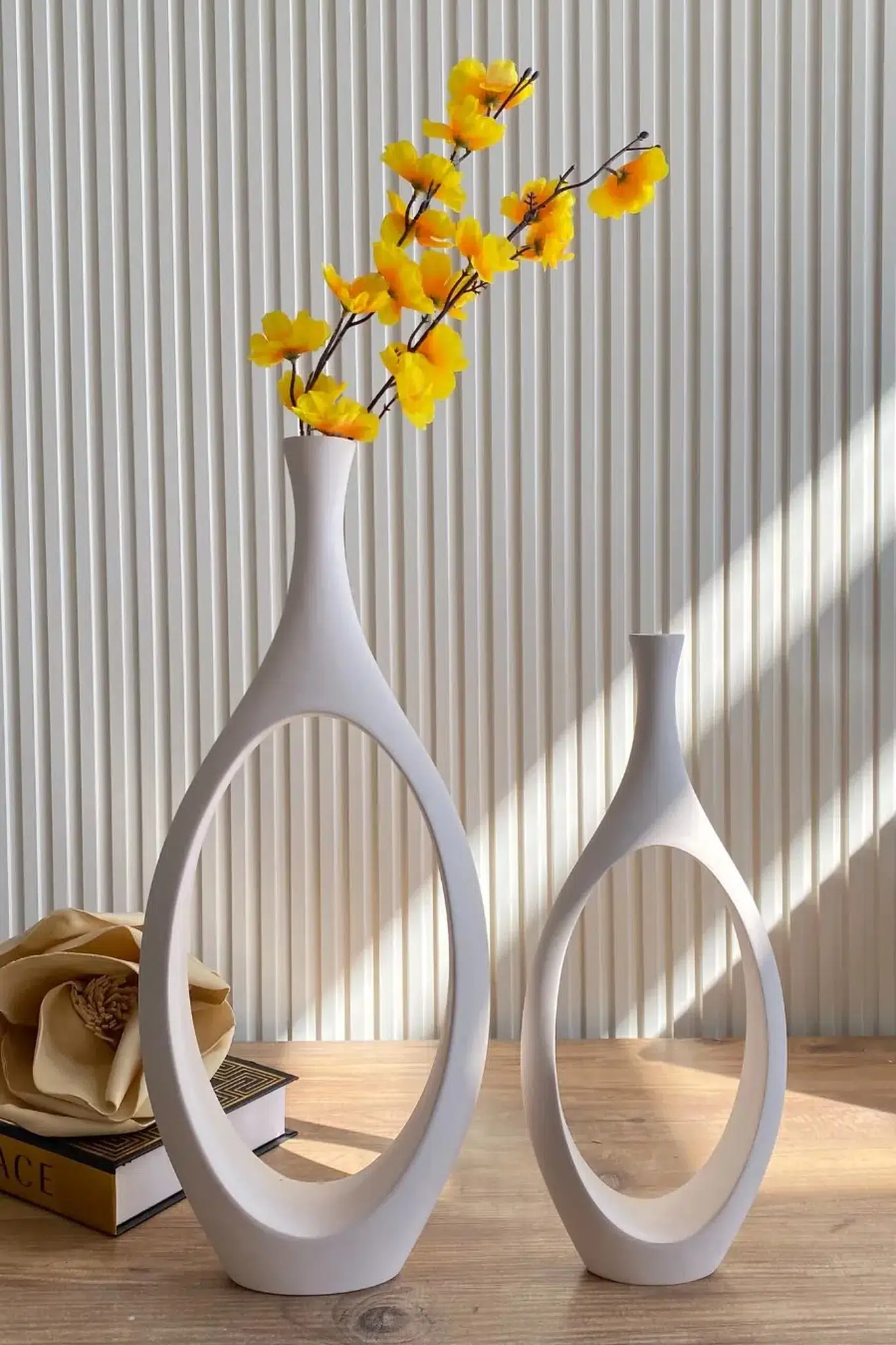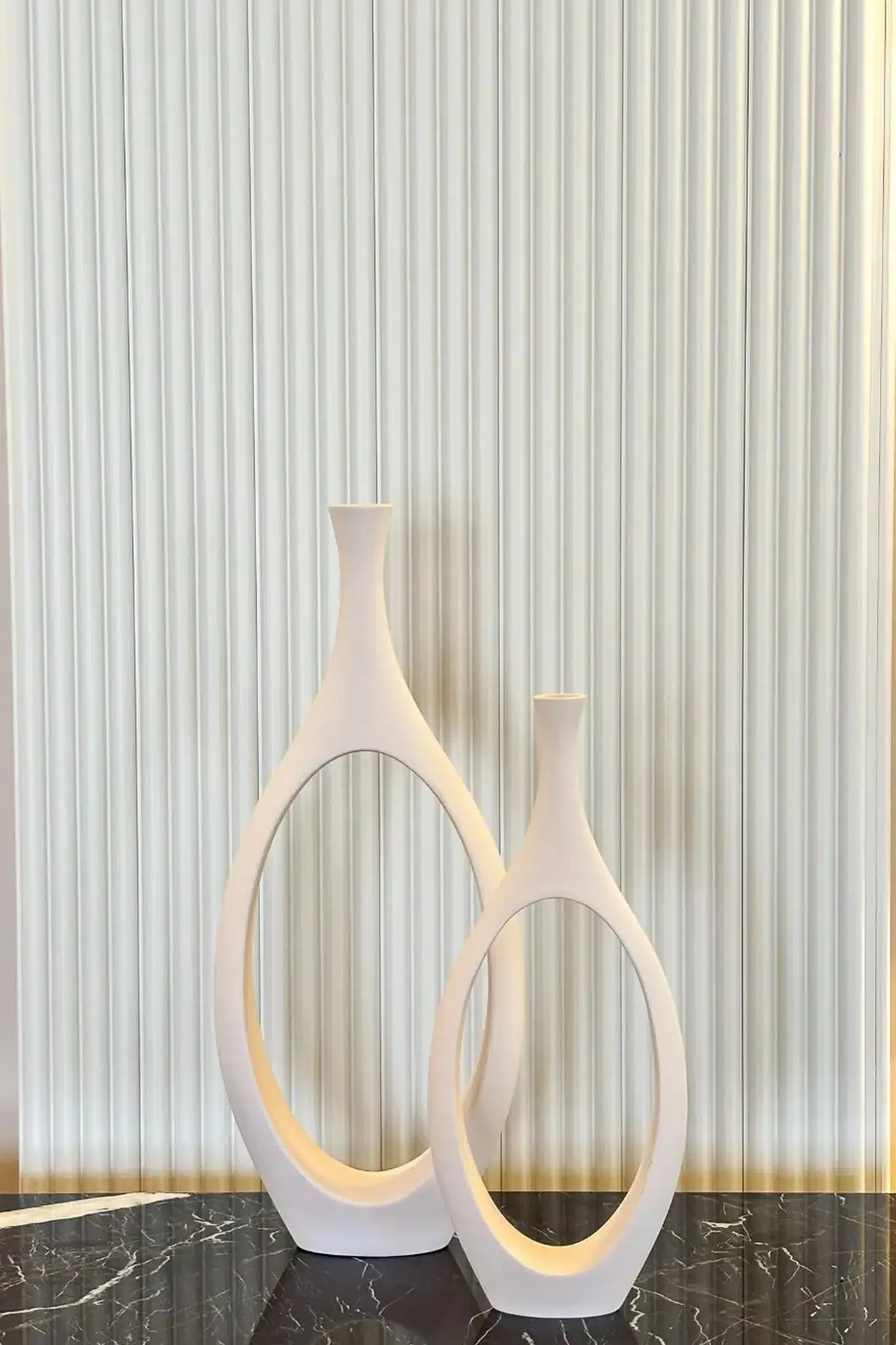Büyük ve küçük boy vazolardan oluşan set, birlikte kullanıldığında dekorasyona bütünlük kazandırırken ayrı ayrı kullanıldığında da güçlü birer dekoratif obje olarak öne çıkar. Salon, konsol, raf, sehpa ve masa üstü alanlarında modern ve dengeli bir görünüm sunar.