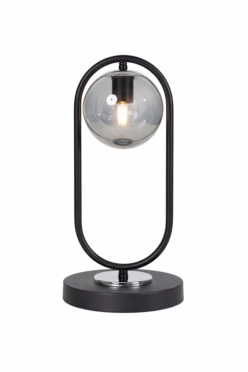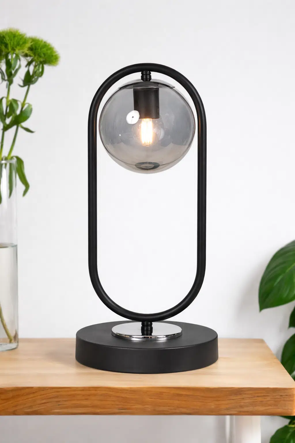 Şık tasarımı ve modern detaylarıyla öne çıkan bu masa lambası modeli, siyah ve krom renkli metal gövdesi ile füme renkli glob camları bir araya getirerek yaşam alanlarına estetik bir dokunuş katar. Dekoratif yapısı sayesinde ev, ofis ve tüm yaşam alanlarında hem aydınlatma hem de tamamlayıcı bir dekor ürünü olarak kullanılabilir.